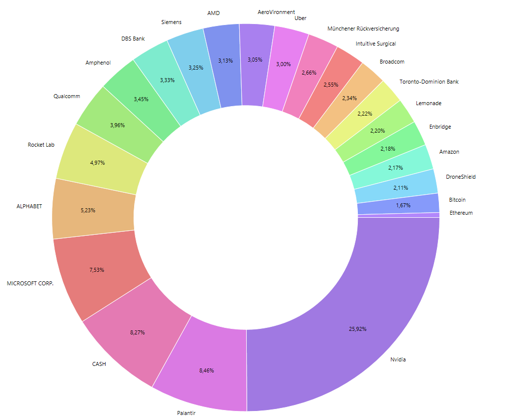 | Nvidia | 25,93% | Bleibt meine größte Position. Das Unternehmen ist der absolute Taktgeber im KI-Bereich und profitiert fundamental von der steigenden Nachfrage nach Rechenleistung und der Robotik. Die Dominanz ist beeindruckend, das Wachstumspotenzial sehe ich weiterhin als sehr stark an. |