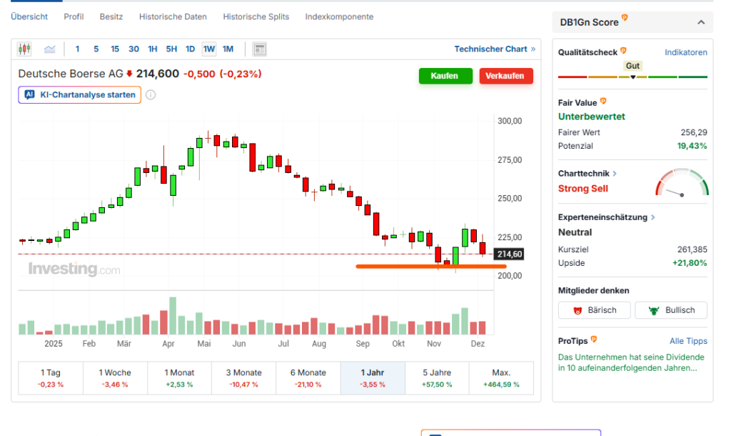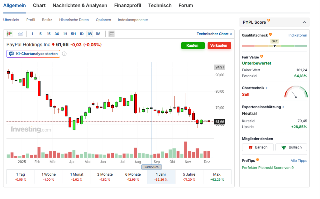 Daher hatte ich als Reaktion darauf zum Teil auch günstiger bewertete Aktien wie PayPal ins Depot genommen. Bei PayPal bin ich charttechnisch aktuell auch fast am Boden eingestiegen, und die Bewertung wird hier langsam echt lächerlich. Zum anderen habe ich die Deutsche Börse ins Depot genommen, mit der Annahme das der Kursverlust bald am Ende sein sollte. Sollte ich mich geirrt haben, dann steige ich hier aus.