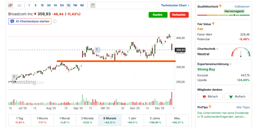 Ich bin selbst in Broadcom investiert, und die Kombination aus der Bewertung, der Kursschwäche nach den Zahlen und dem Chartbild lässt mich aktuell sondieren: Ich bin in Broadcom investiert, aber offensichtlich bin ich etwas zu spät reingekommen. Die ehrliche Antwort ist: Es sieht ganz danach aus. Aber genau das ist Teil des Spiels. Die Aktie kann bis in den Bereich, wo ich die Unterstützung eingezeichnet habe, fallen.