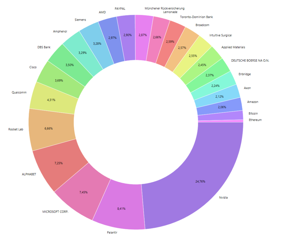 Auch wenn die Zahl von 22 Aktienpositionen plus Bitcoin hoch ist, wird die Strategie durch die Konzentration auf die Top-Positionen gewährleistet. Meine größten Wetten (Nvidia mit 24,76%, Palantir, Microsoft, Alphabet und Rocket Lab) tragen den Löwenanteil des Risikos und der erwarteten Rendite. Die Positionen reduziere ich vielleicht noch demnächst wieder.